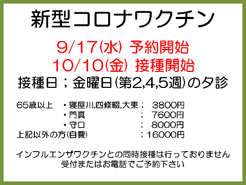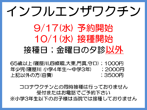 ●2025年秋~冬のインフルエンザワクチン・新型コロナワクチンのご案内です。9/17(水)より予約を開始します。